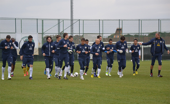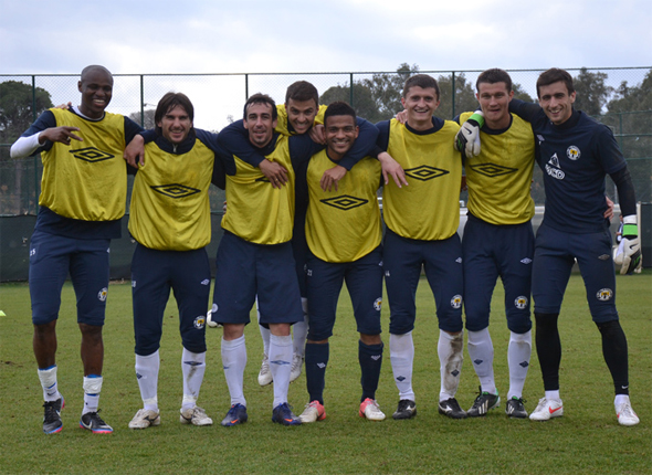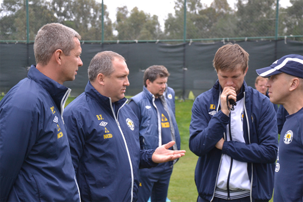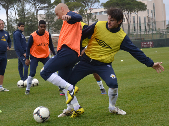 Полуторачасовое занятие на поле спорткомплекса Calista было динамичным. Футболисты, после пробежки и растяжки, позанимались в «квадратах». Затем Юрий Максимов, вместе с помощниками, предложили два упражнения. Одно было направлено на держание мяча, а затем игроки были поделены на 2 команды, по 8 человек в каждой. Эта двусторонка была не очень привычной. Двое ворот в центре поля были поставлены друг к другу тыльной стороной. Задача была выиграть поединок. В упорной борьбе побелили желтые. Все решил последний гол Велизара Димитрова – 5:4. В составе желтых играли: Мусиенко, Барановский, Прийма, Димитров, Лазич, Мораес, Эбесилио и Траоре.![]()